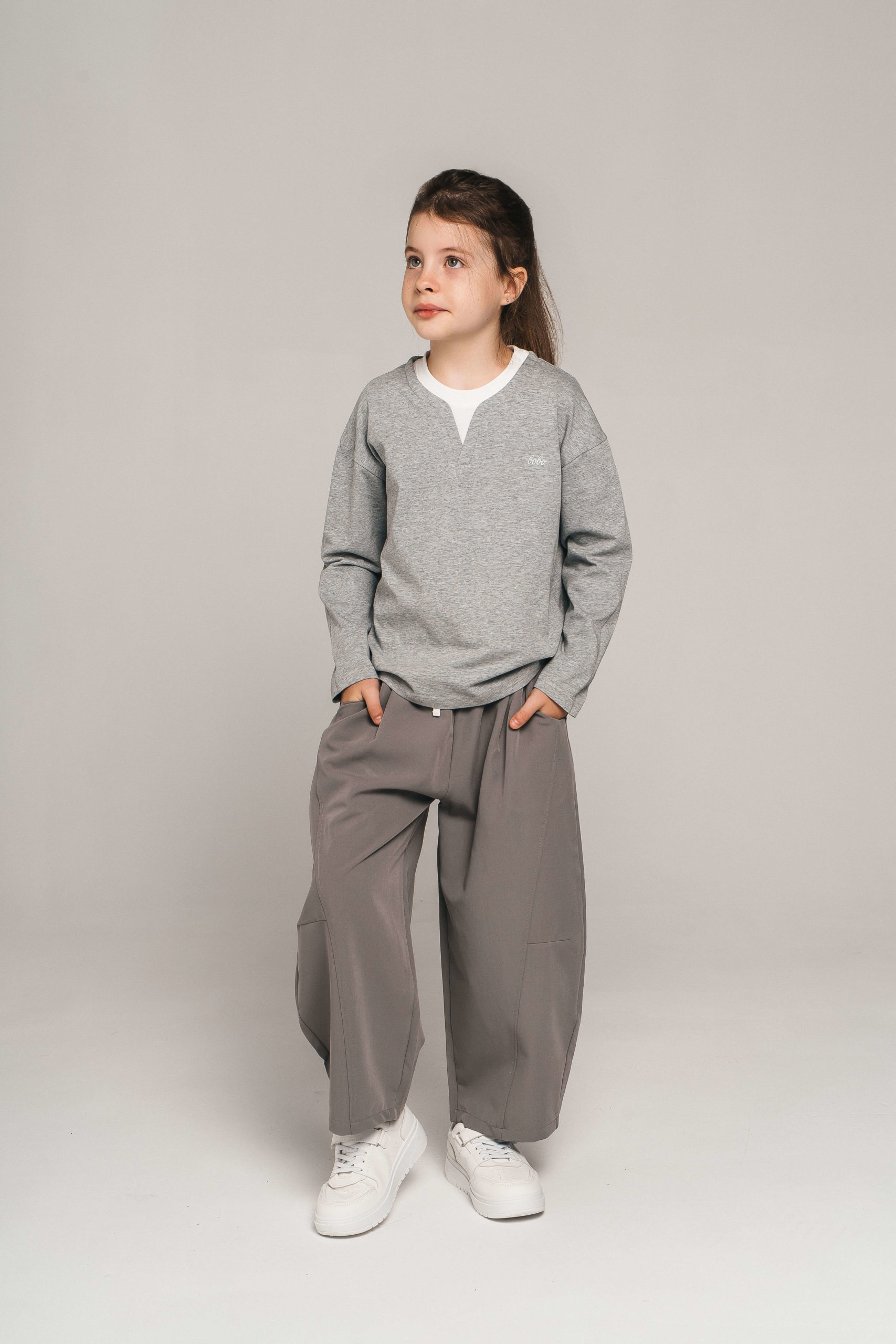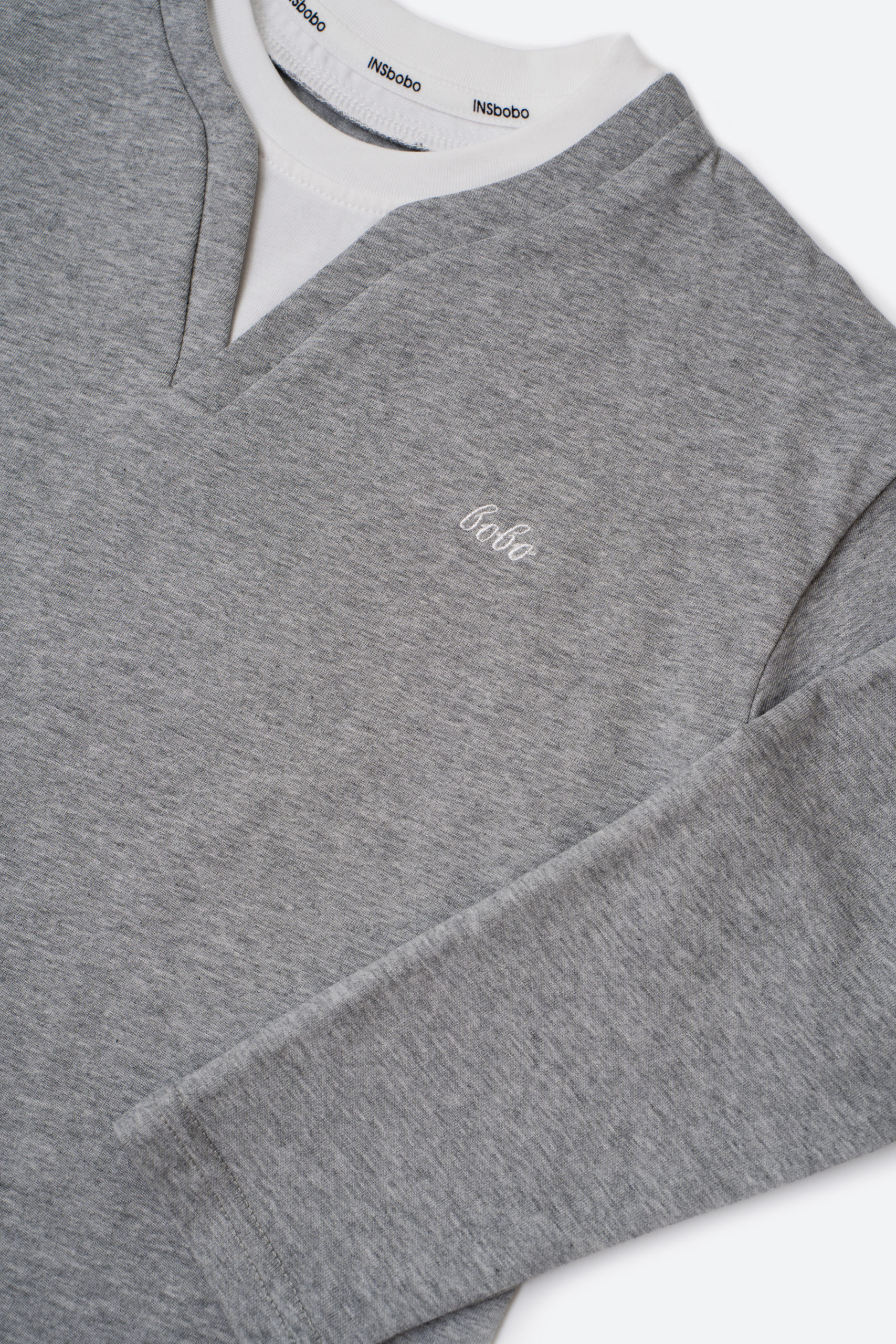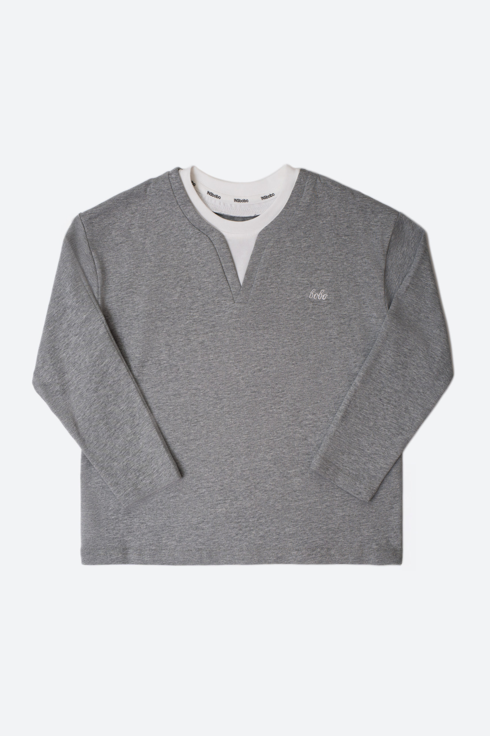 Универсальный серый лонгслив с эффектом двух слоёв — стильное и практичное решение на каждый день. Контрастная вставка и V-образный вырез создают аккуратный, модный образ. Изготовлен из мягкого и приятного к телу хлопка.