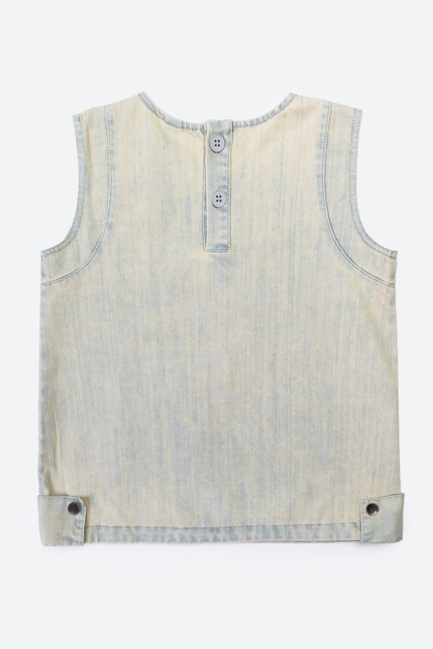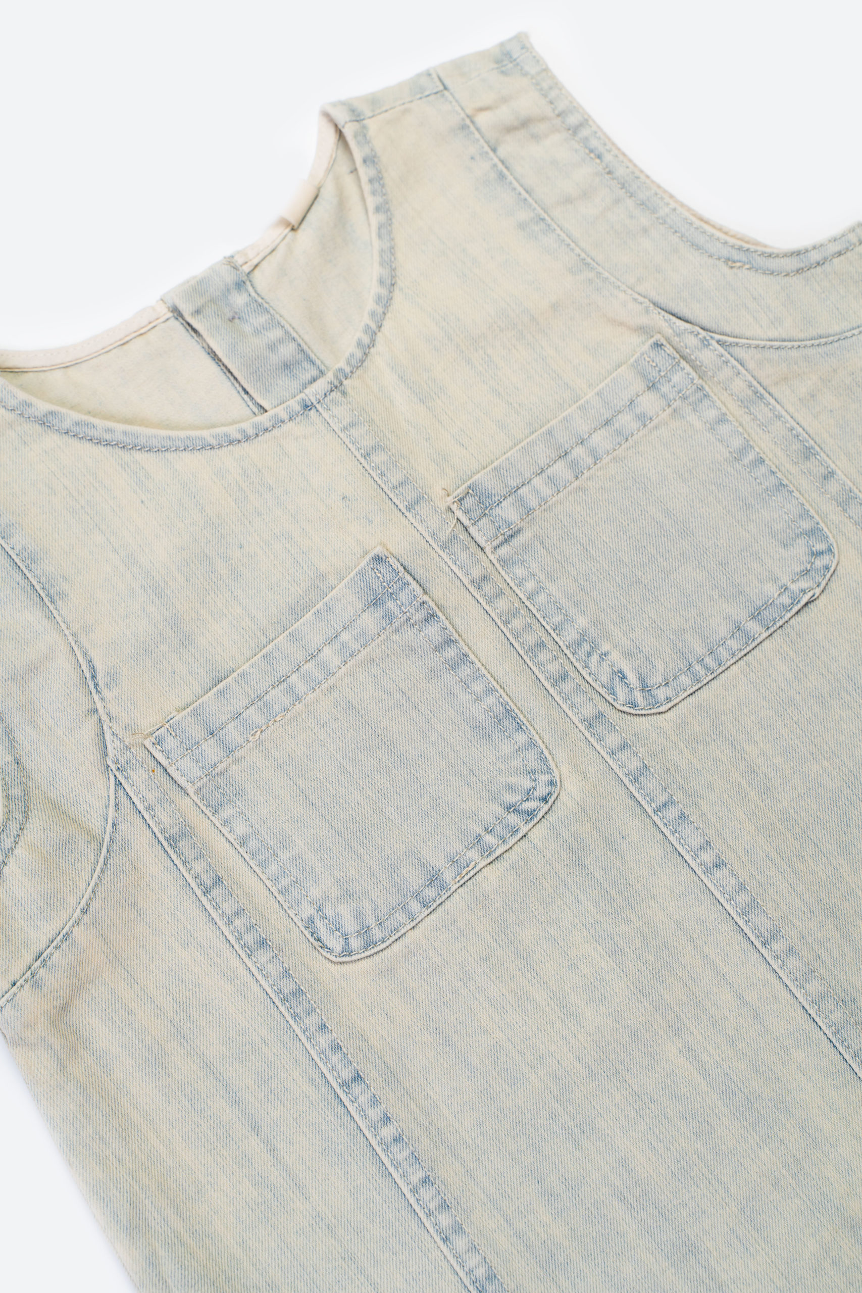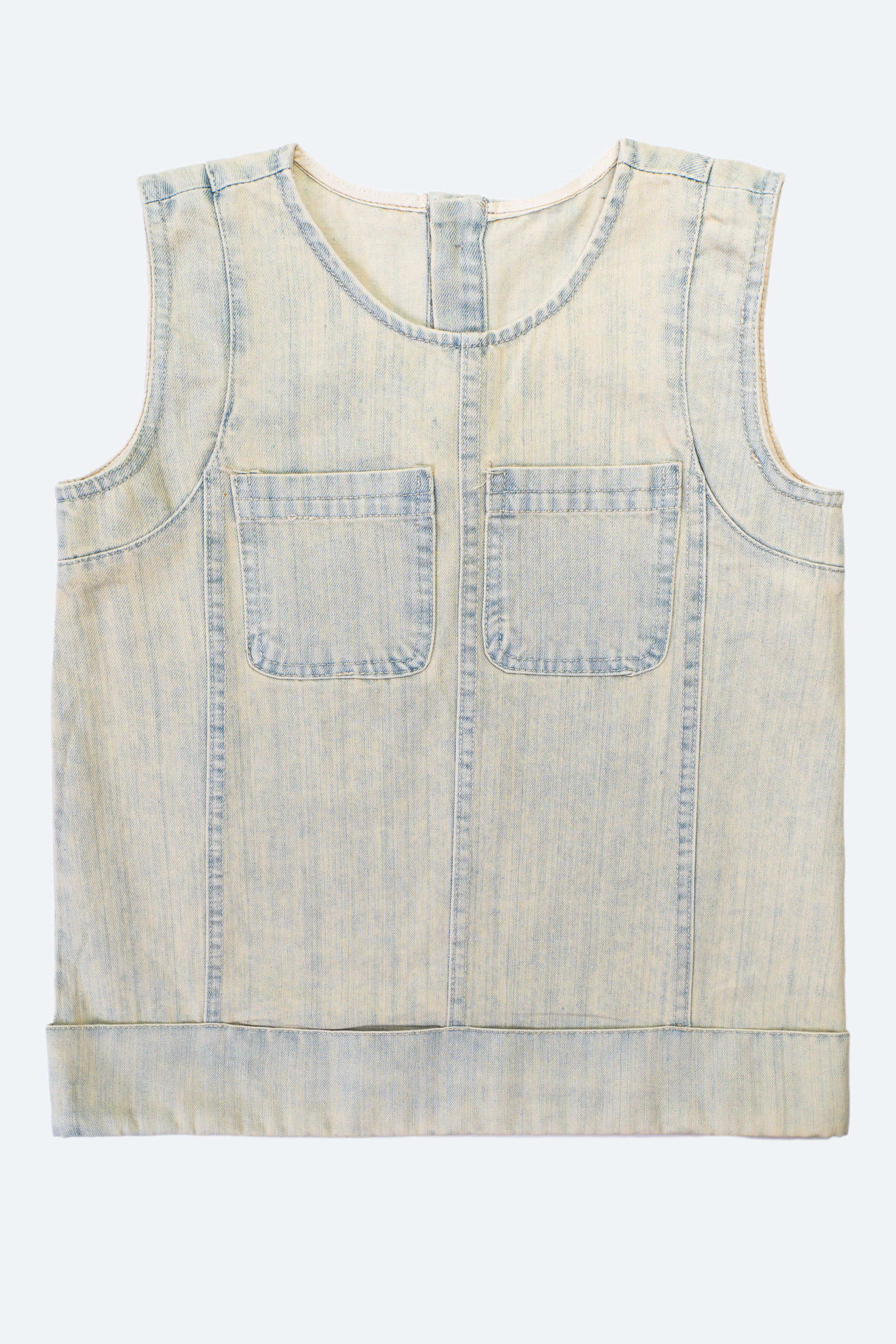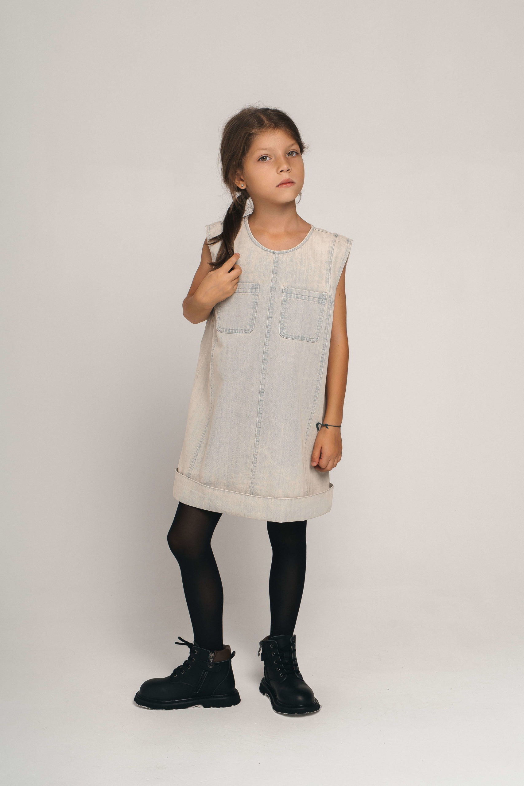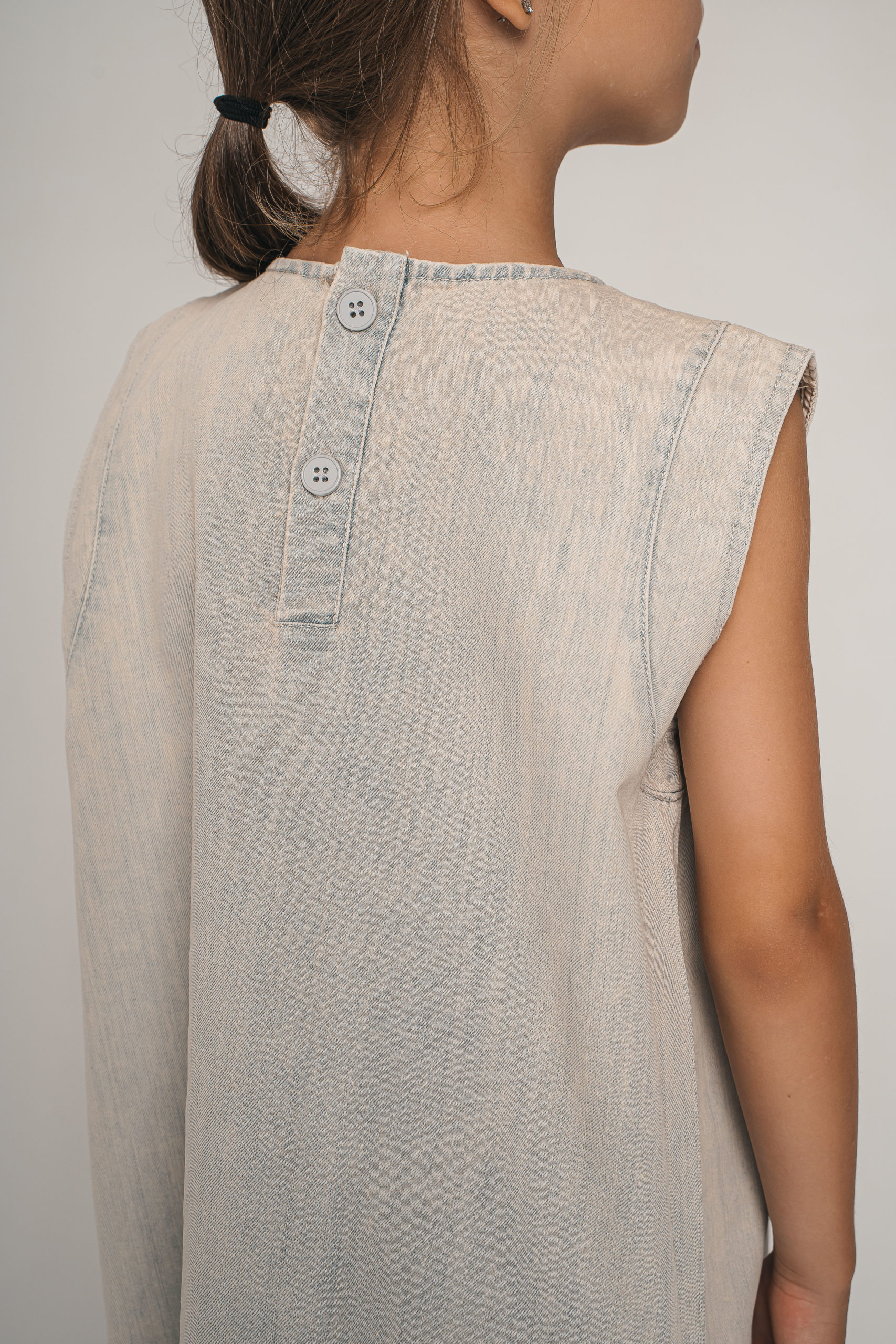 Стильное джинсовое платье с двумя нагрудными карманами. Лаконичный дизайн без рукавов