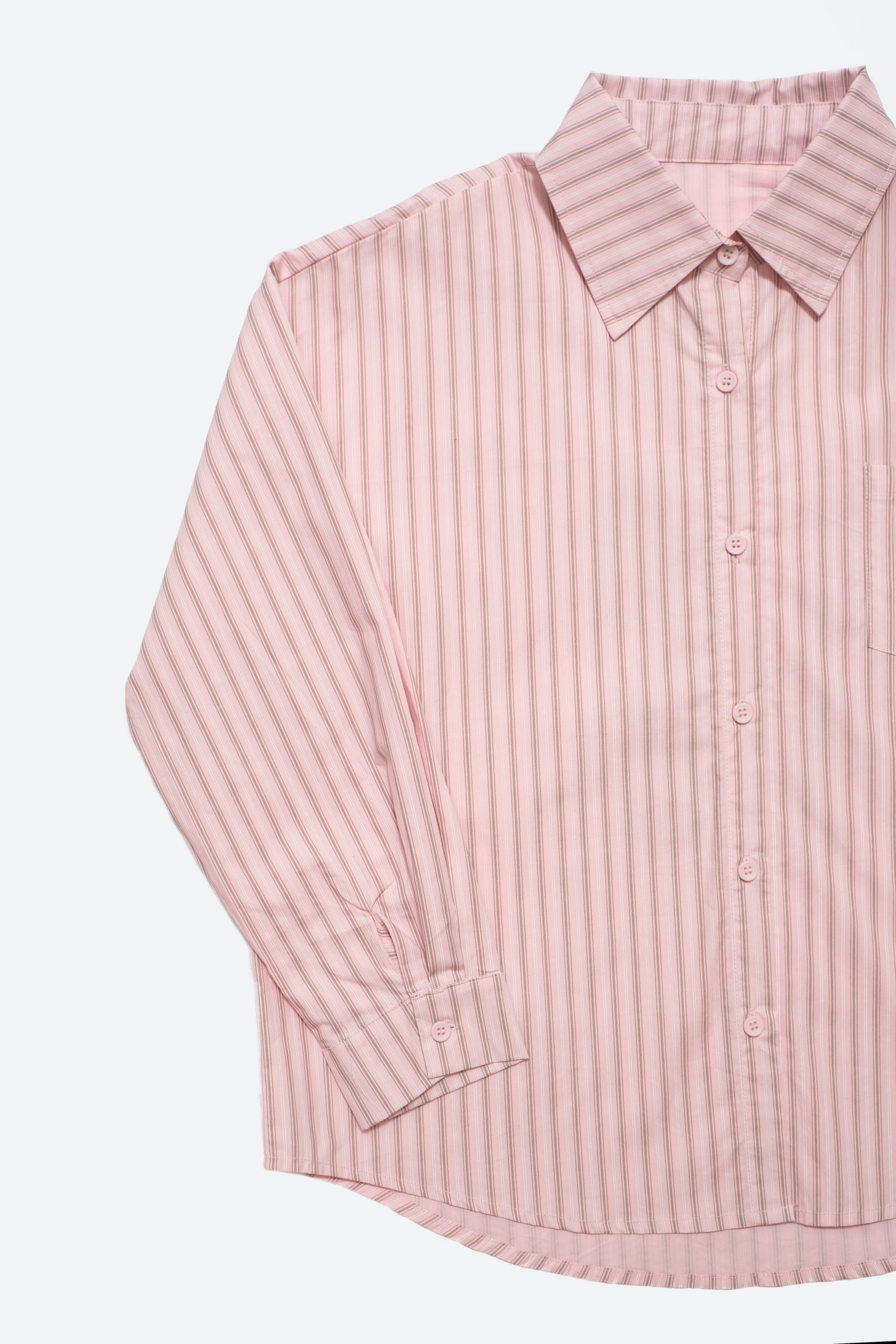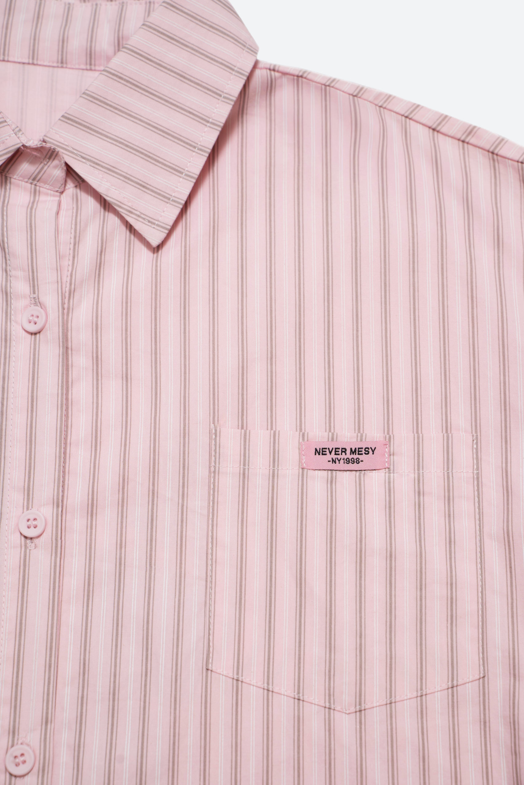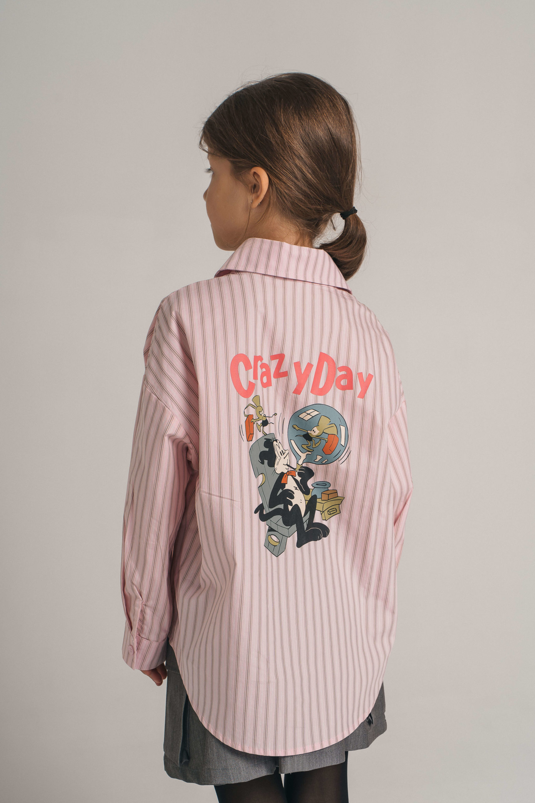 Эта рубашка для девочки сочетает в себе классический крой. Модель выполнена из мягкого хлопка в розово-белую полоску, имеет прямой силуэт, отложной воротник и длинные рукава с манжетами на пуговицах. Спереди — аккуратный накладной карман с небольшой нашивкой.