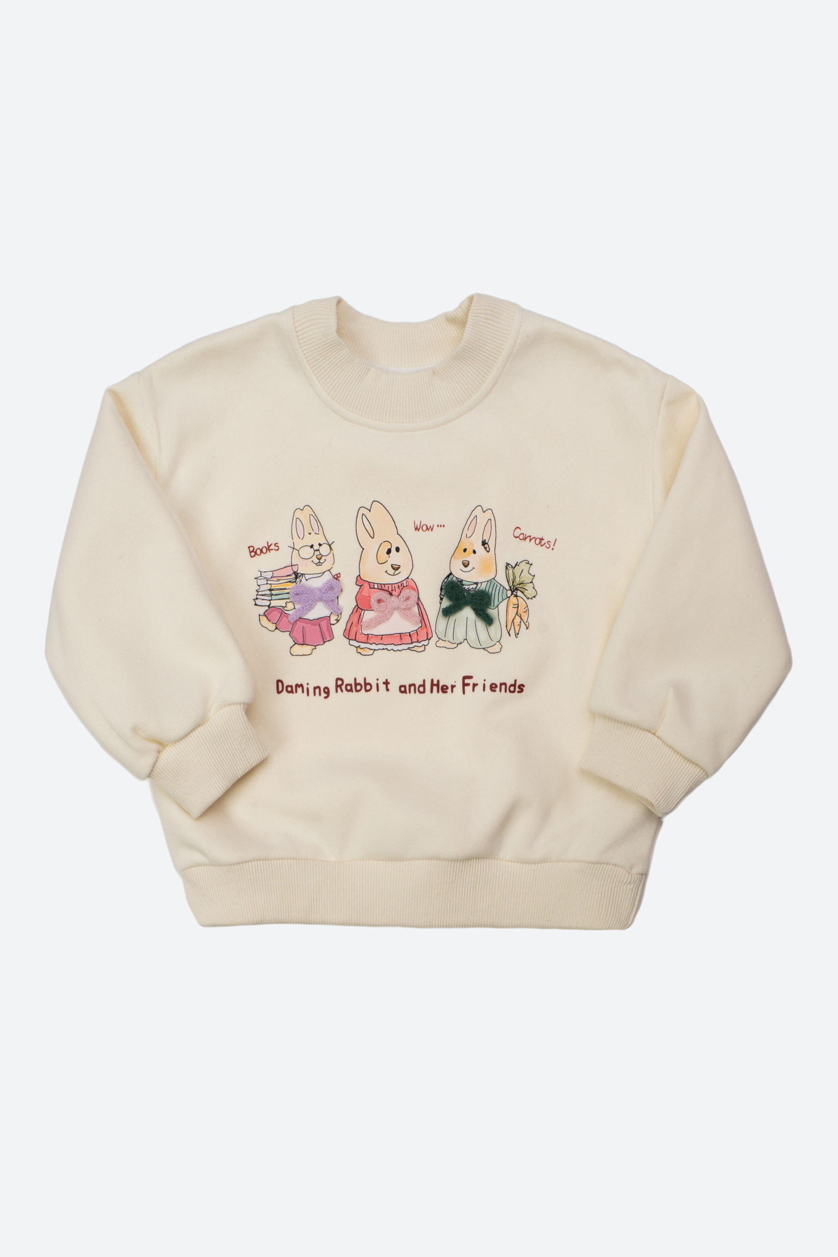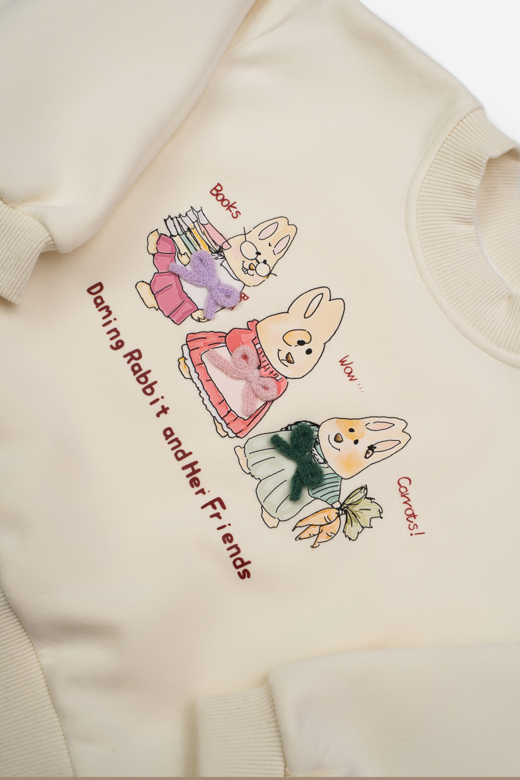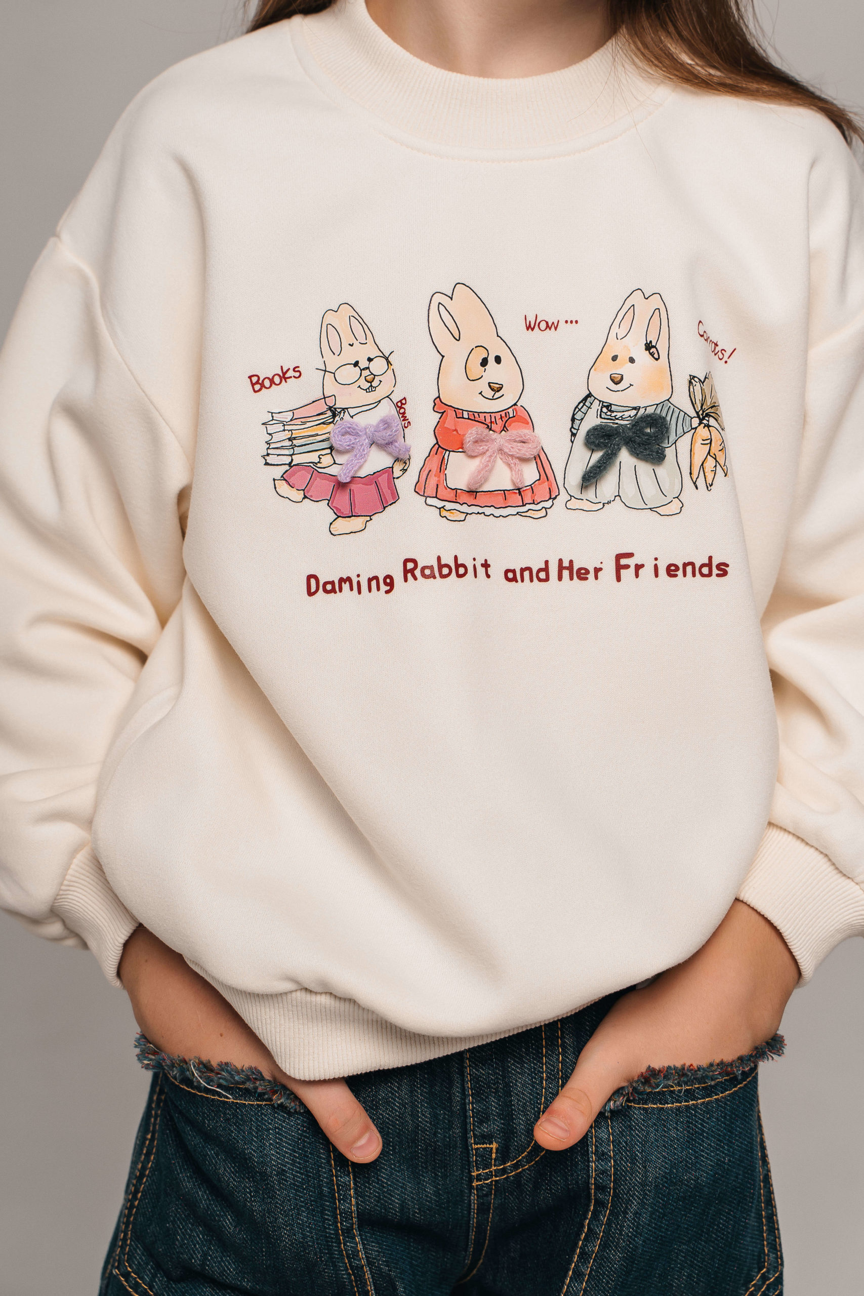 Мягкий и уютный свитшот с милым принтом трёх зайчат в разных образах.Украшен объёмными вязанными бантиками, которые добавляют фактуры.