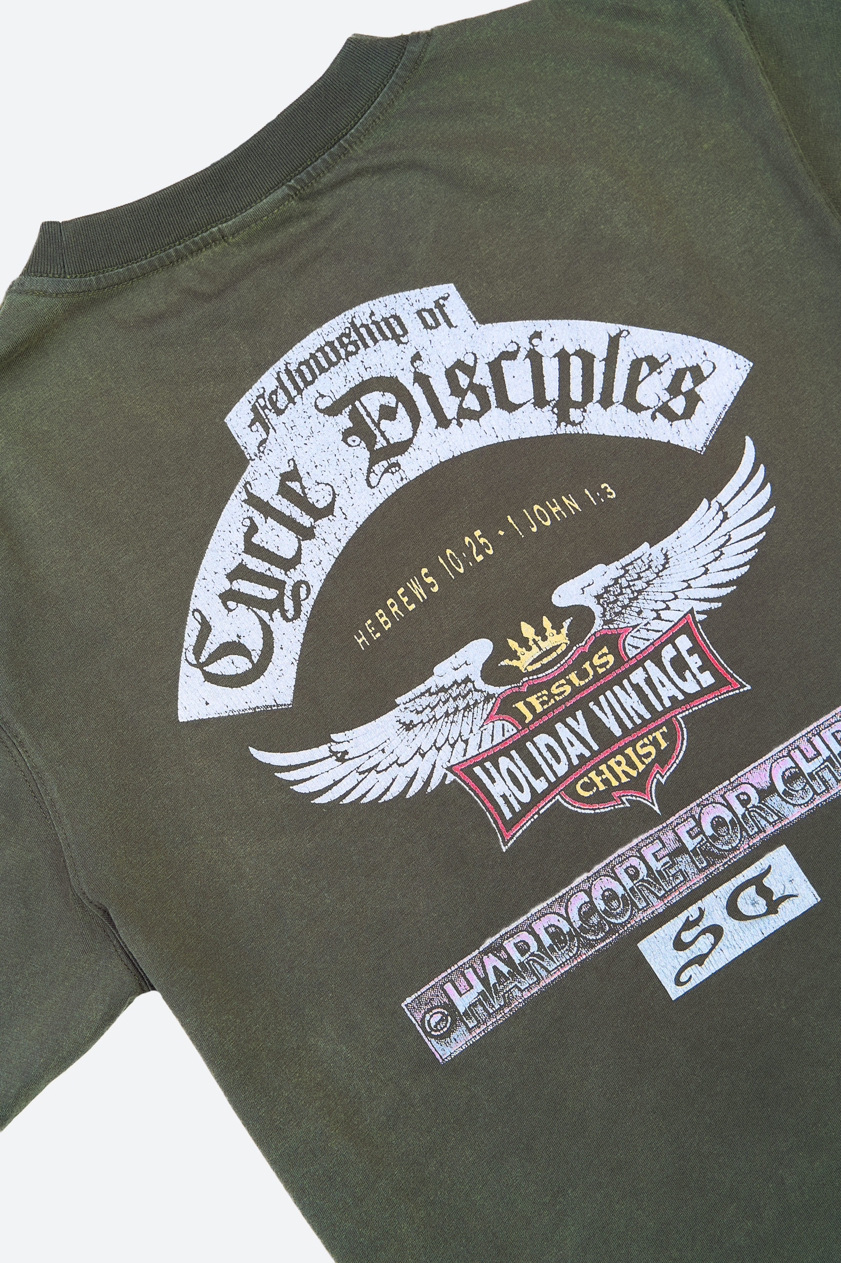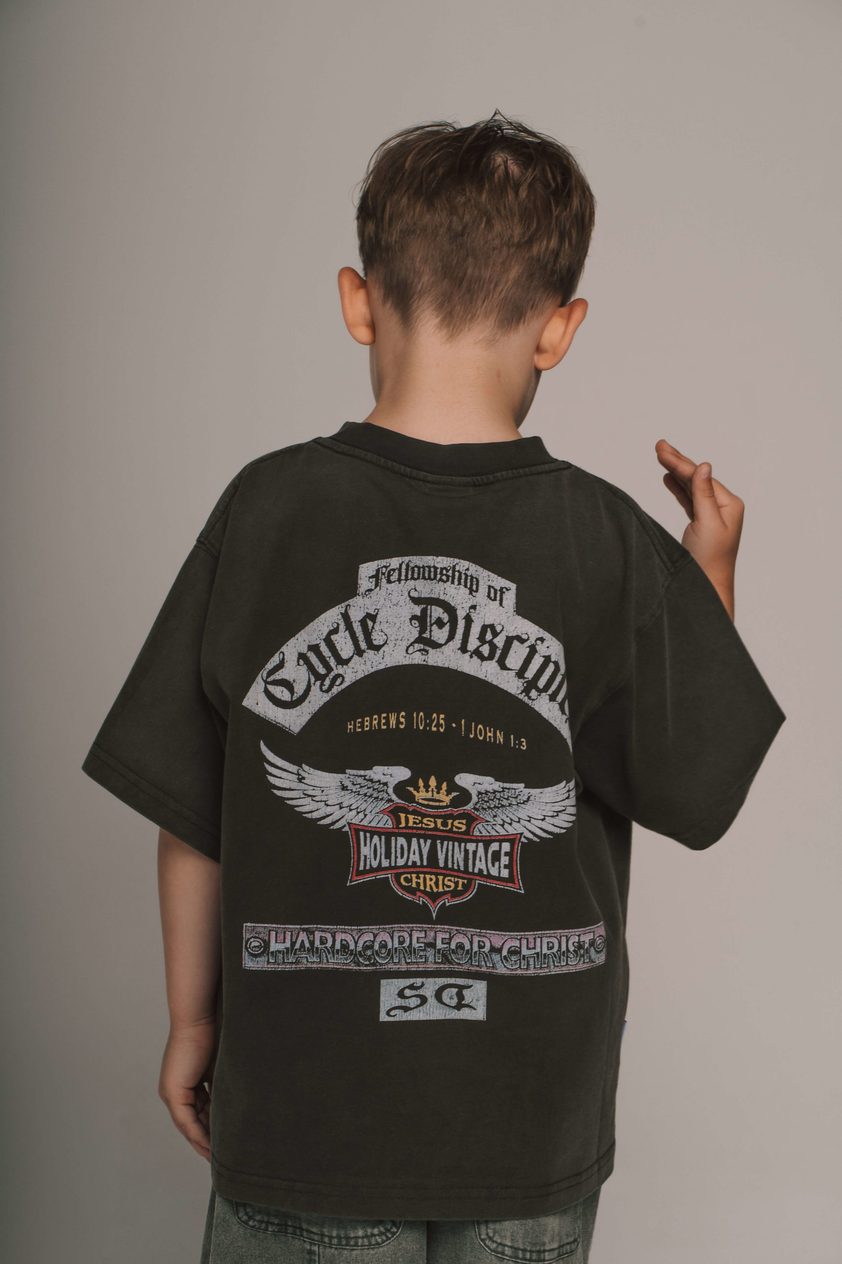 Футболка в винтажном стиле. Модель выполнена из мягкого хлопка тёмно-оливкового цвета и украшена красочным принтом.