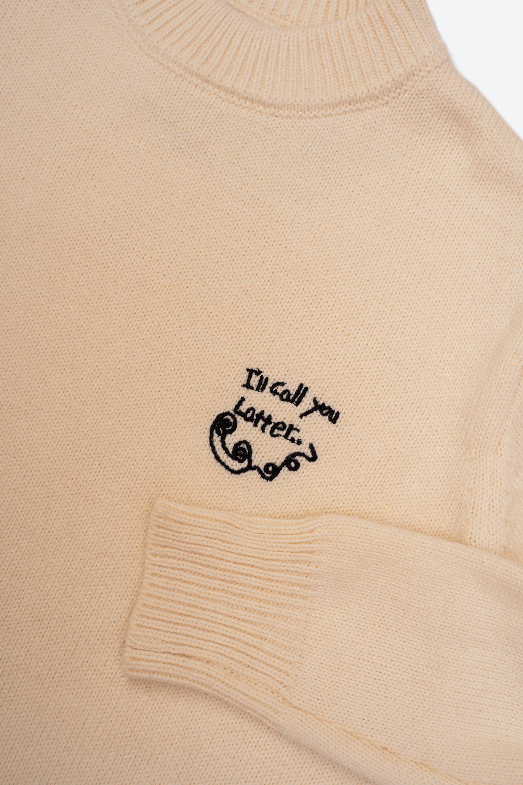Свитер бежевого цвета с вышивкой. Мягкий, уютный, с воротом-стойкой и аккуратной резинкой по краям.