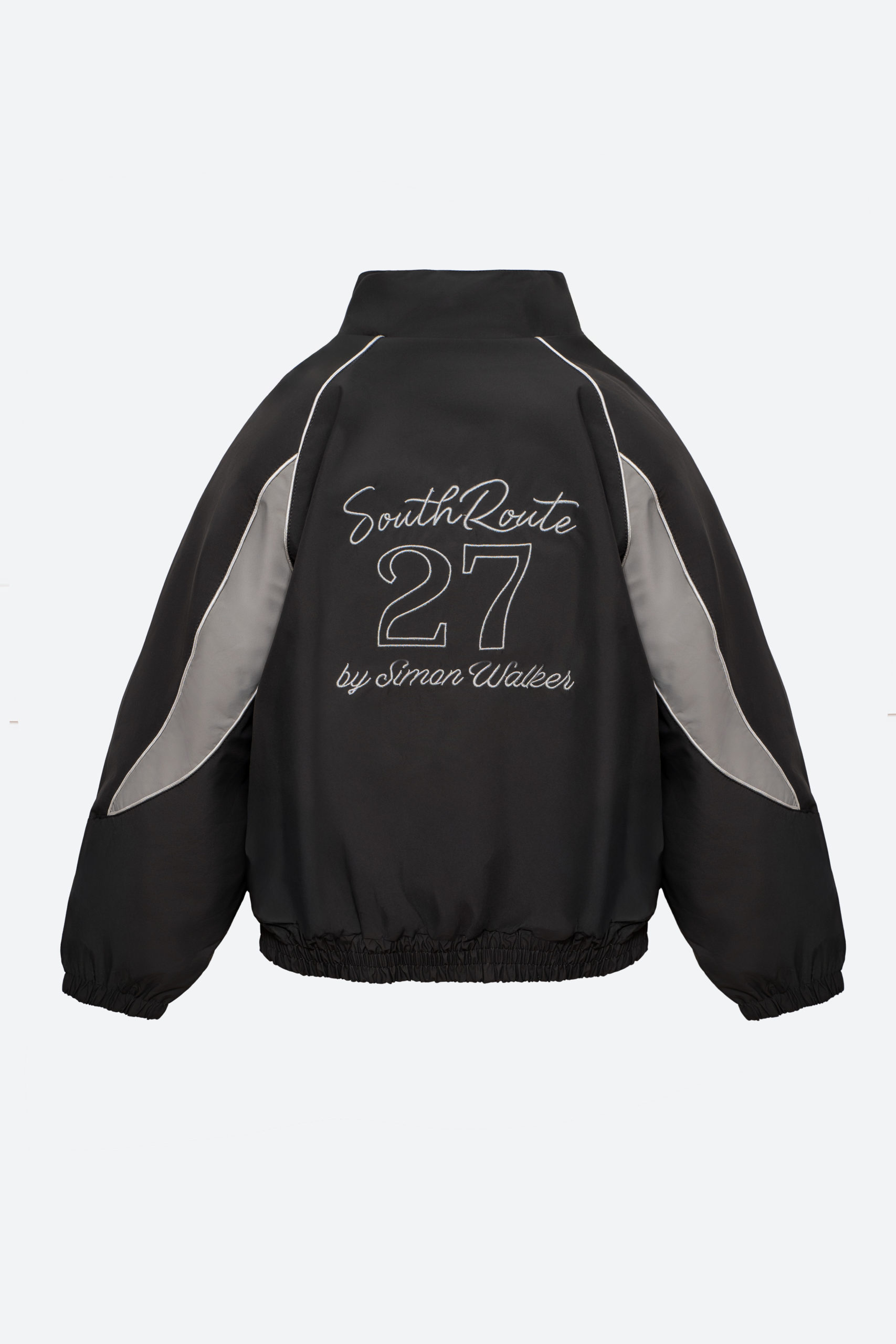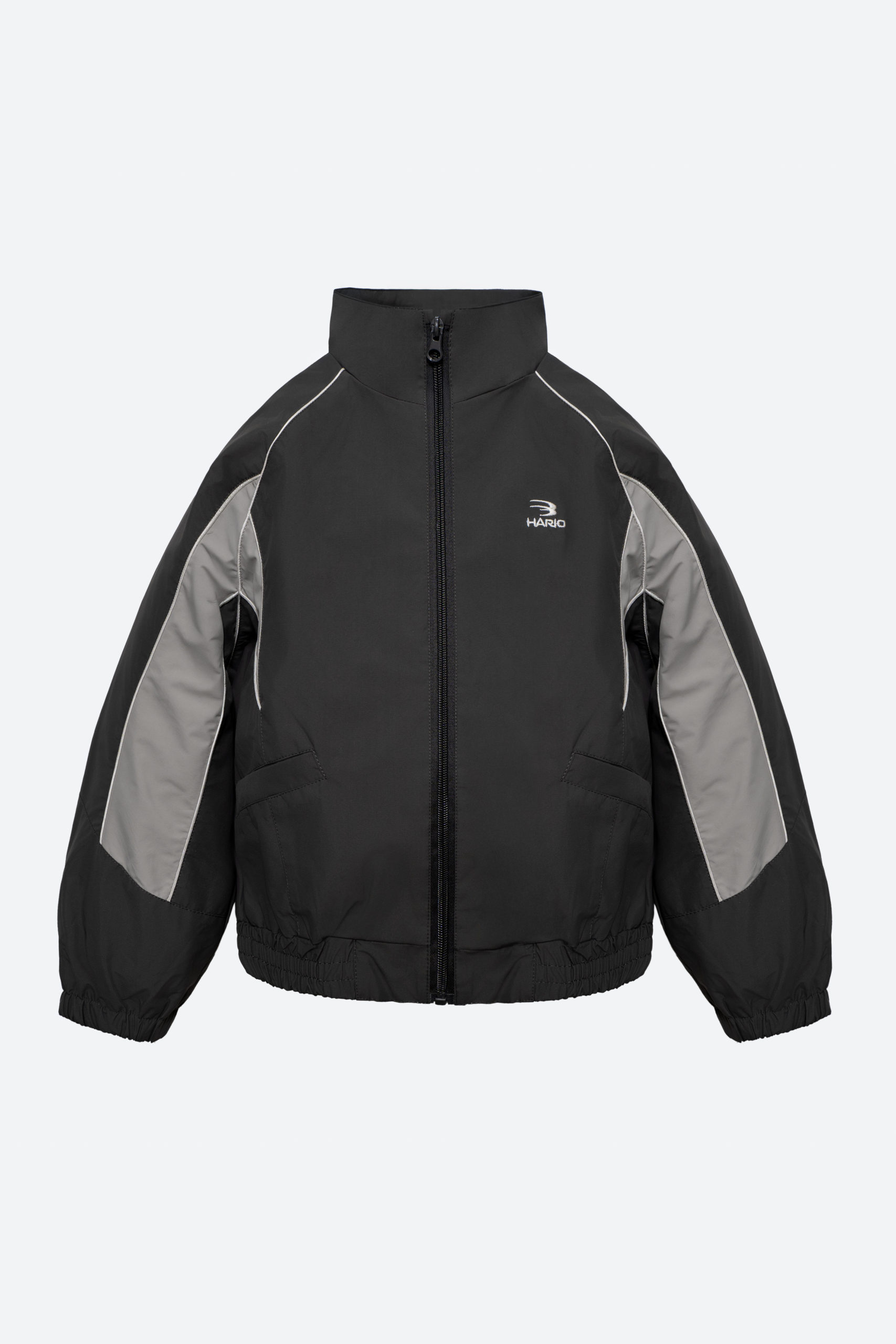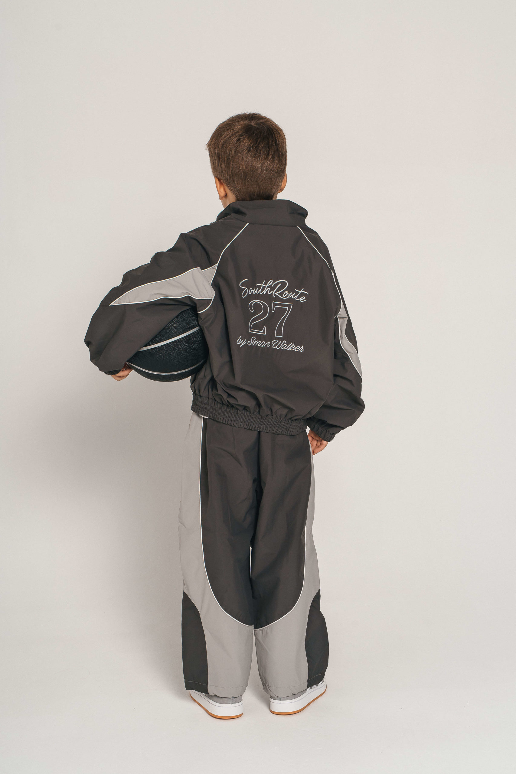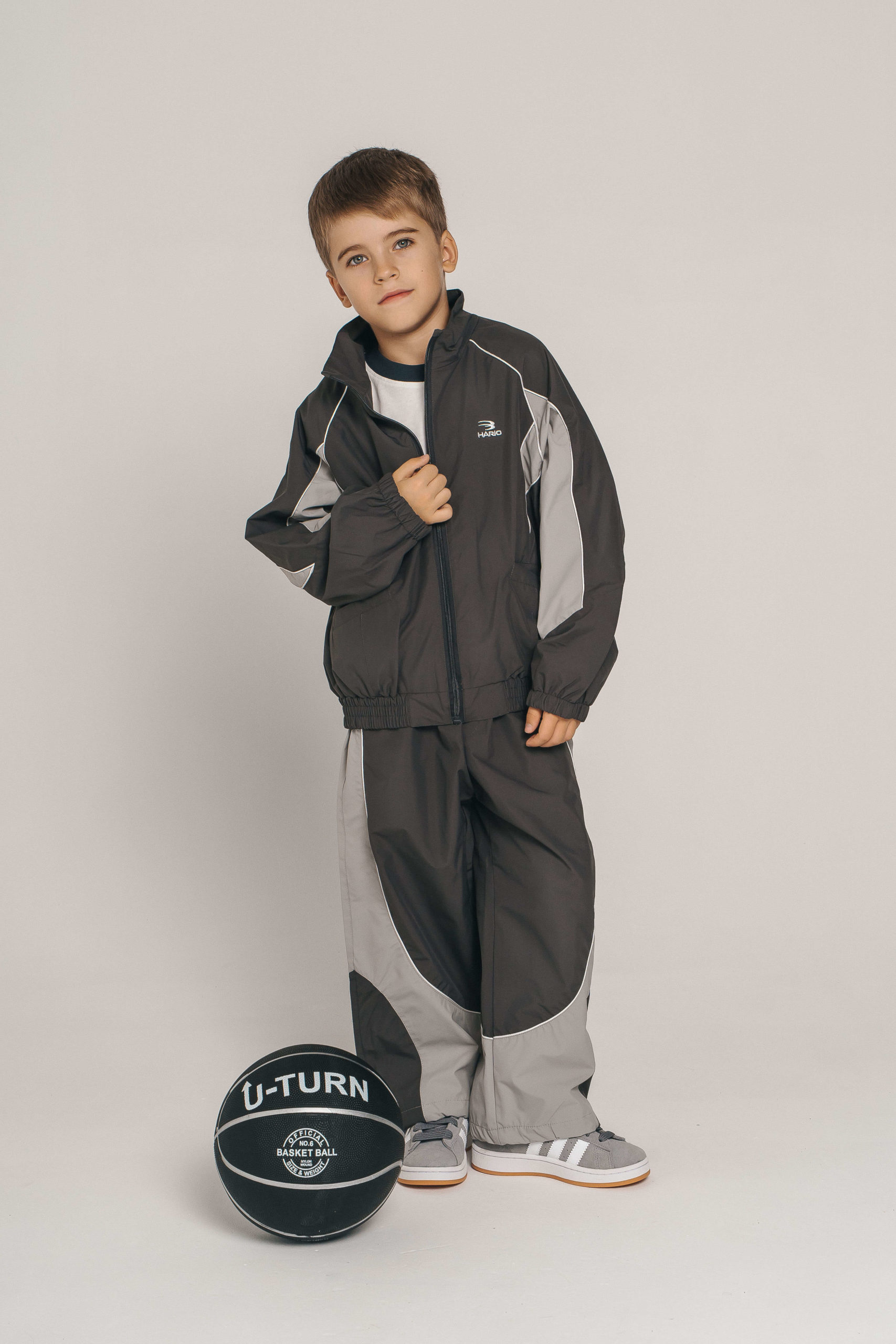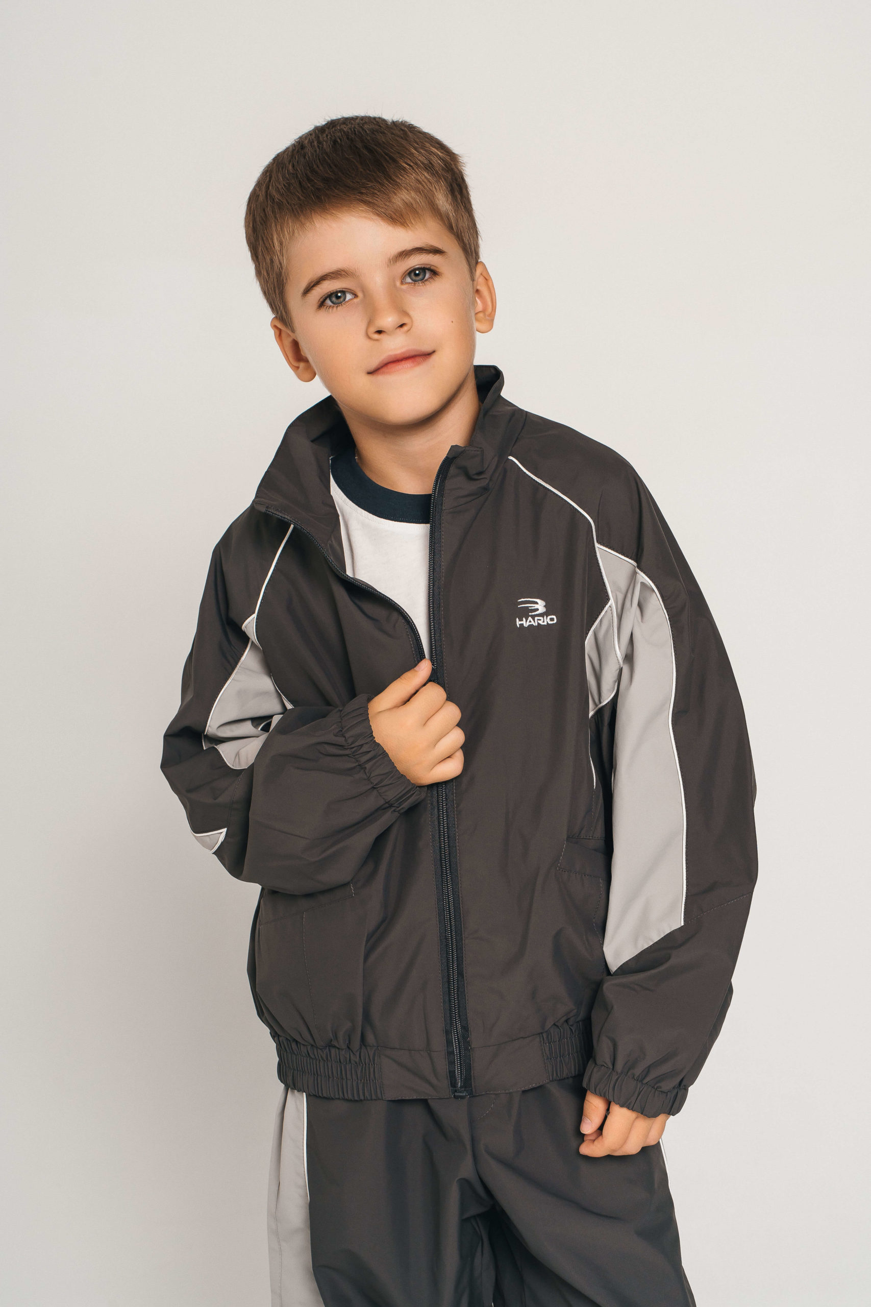 Практичный и стильный спортивный комплект для мальчика, состоящий из куртки и брюк. Выполнен в универсальной цветовой гамме — чёрный с серыми вставками и контрастной белой отделкой.